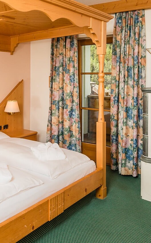 Armoniche, accoglienti e tranquille. Le nostre camere con stufa di maiolica, letto a baldacchino e balcone con vista da sogno.